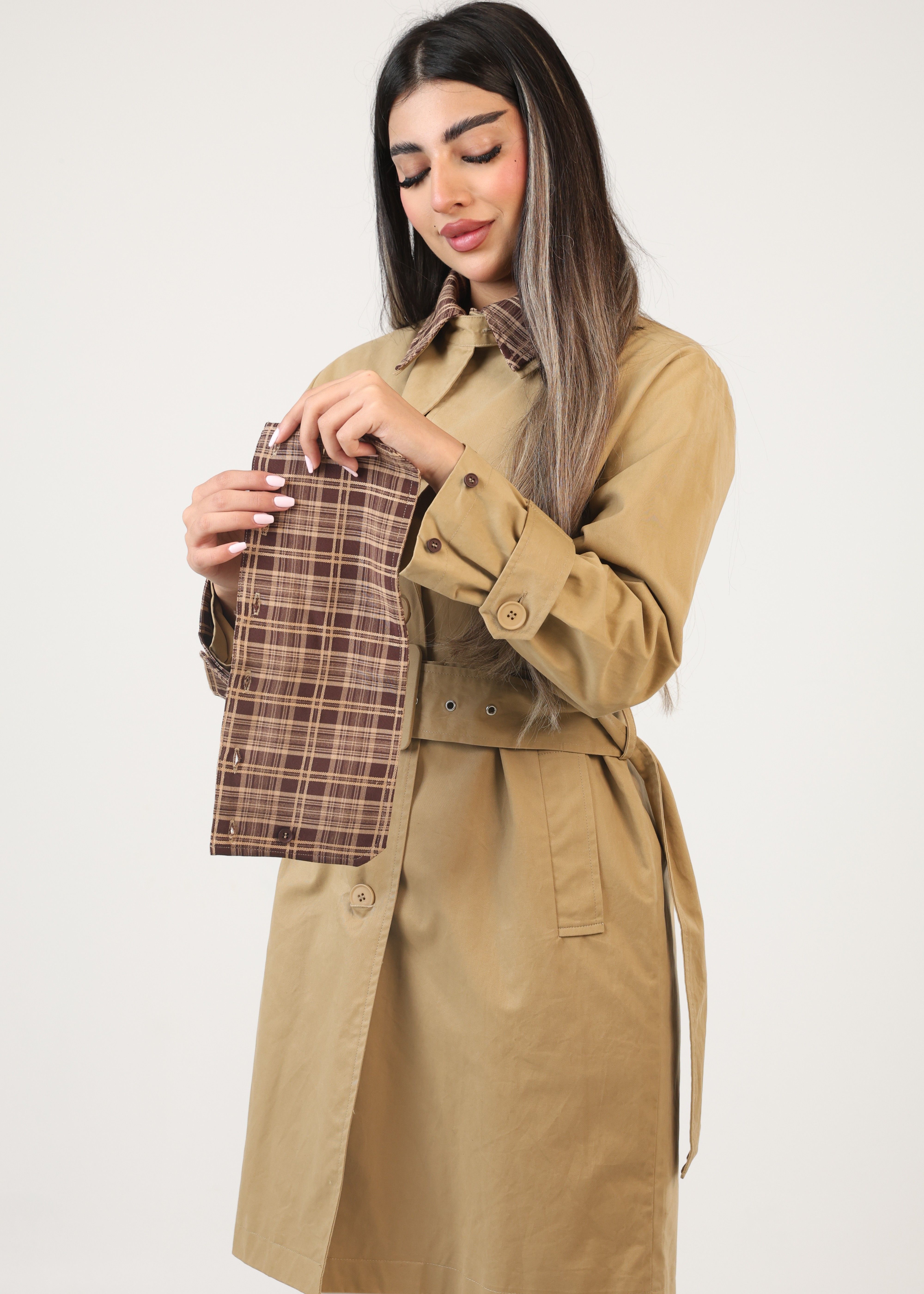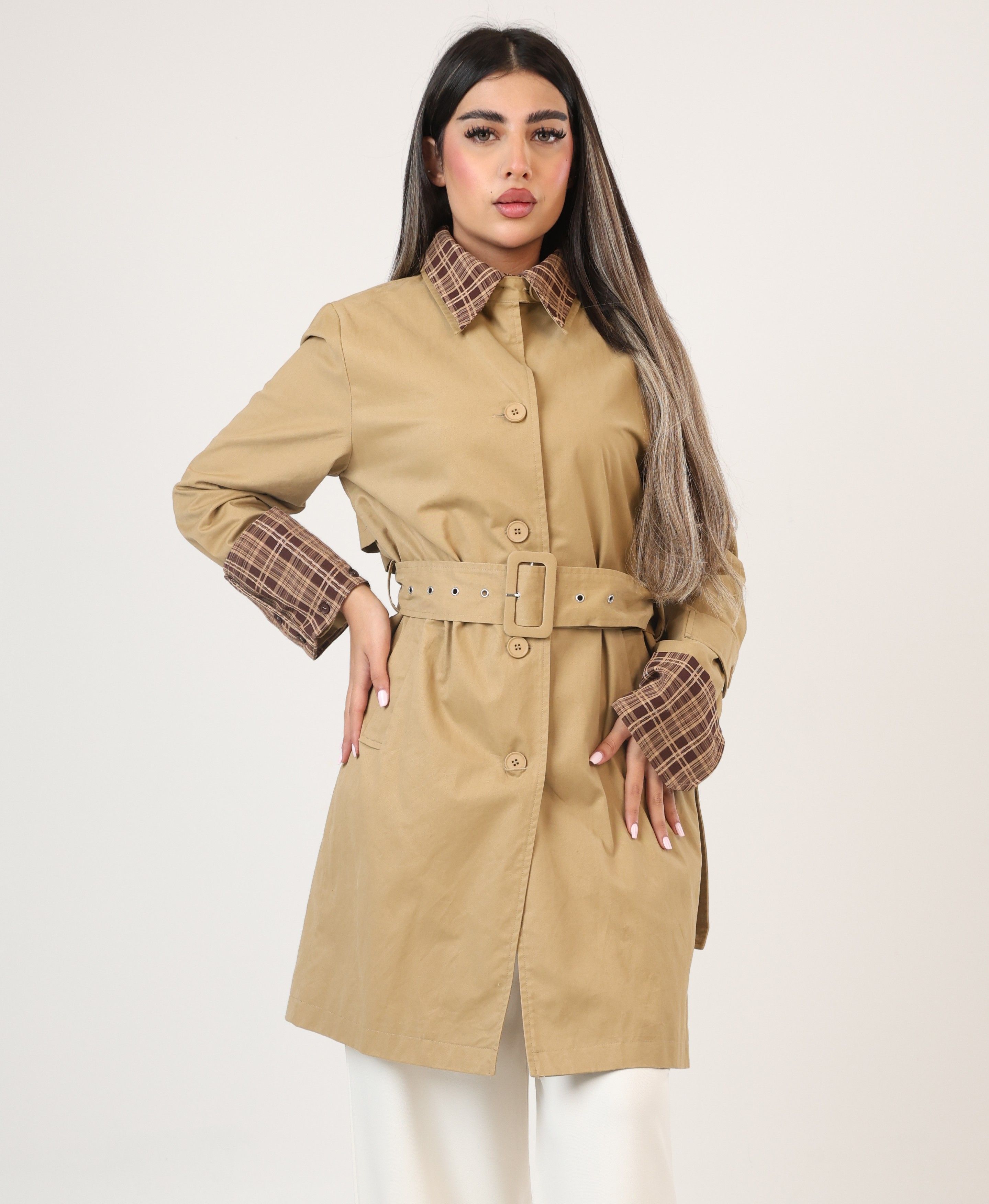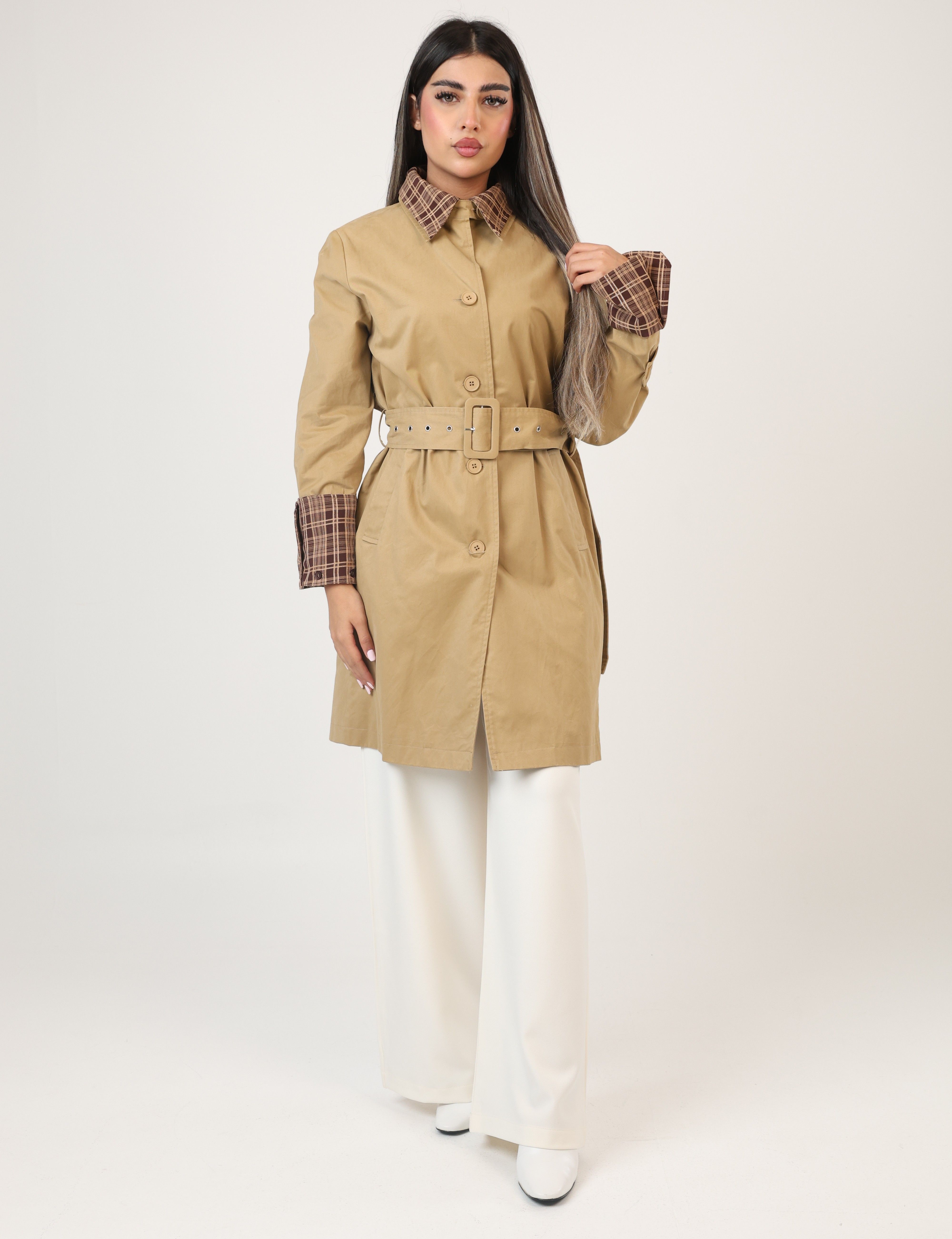 112517 - Plaid collar Trench coat - Mocha