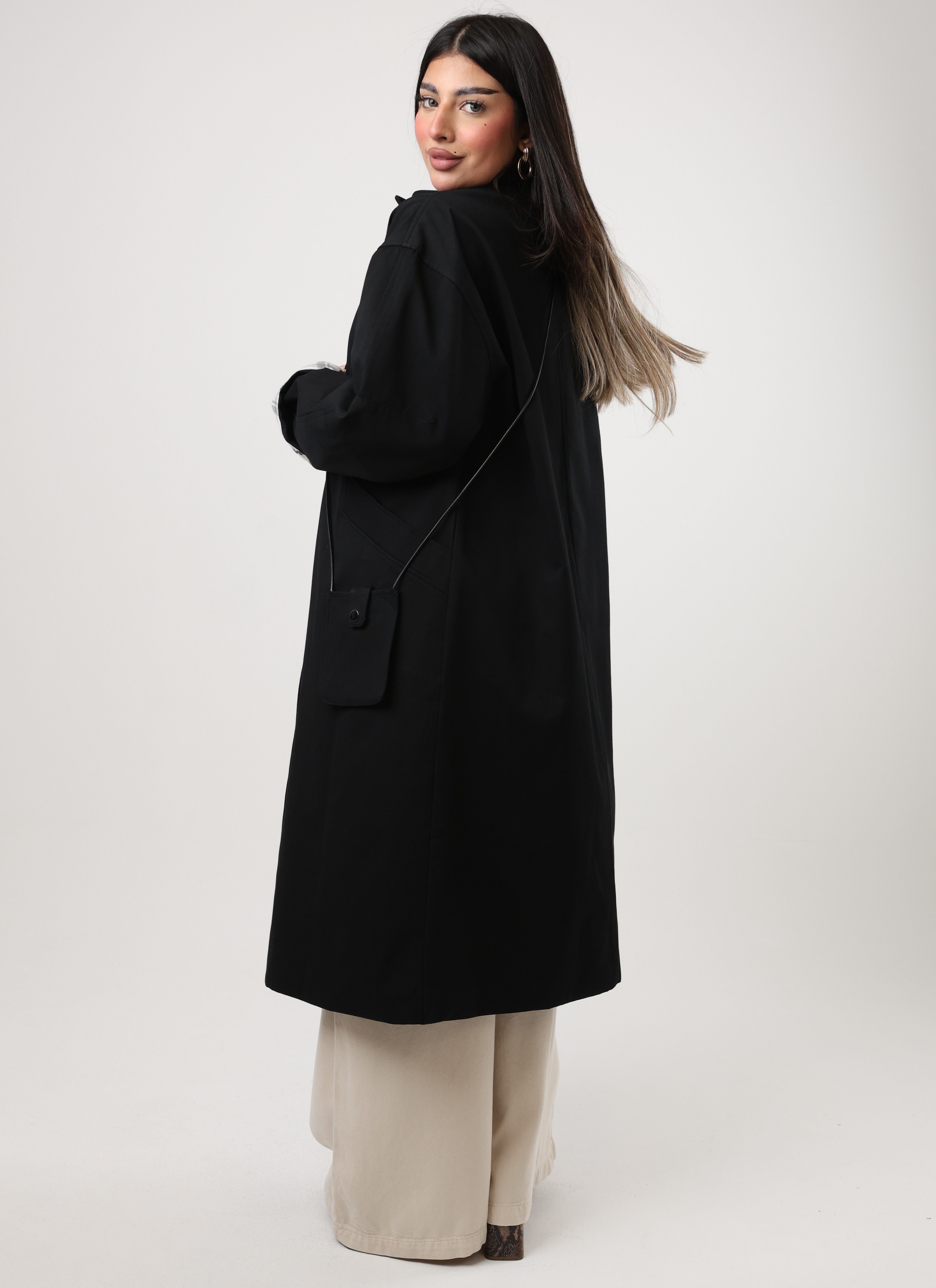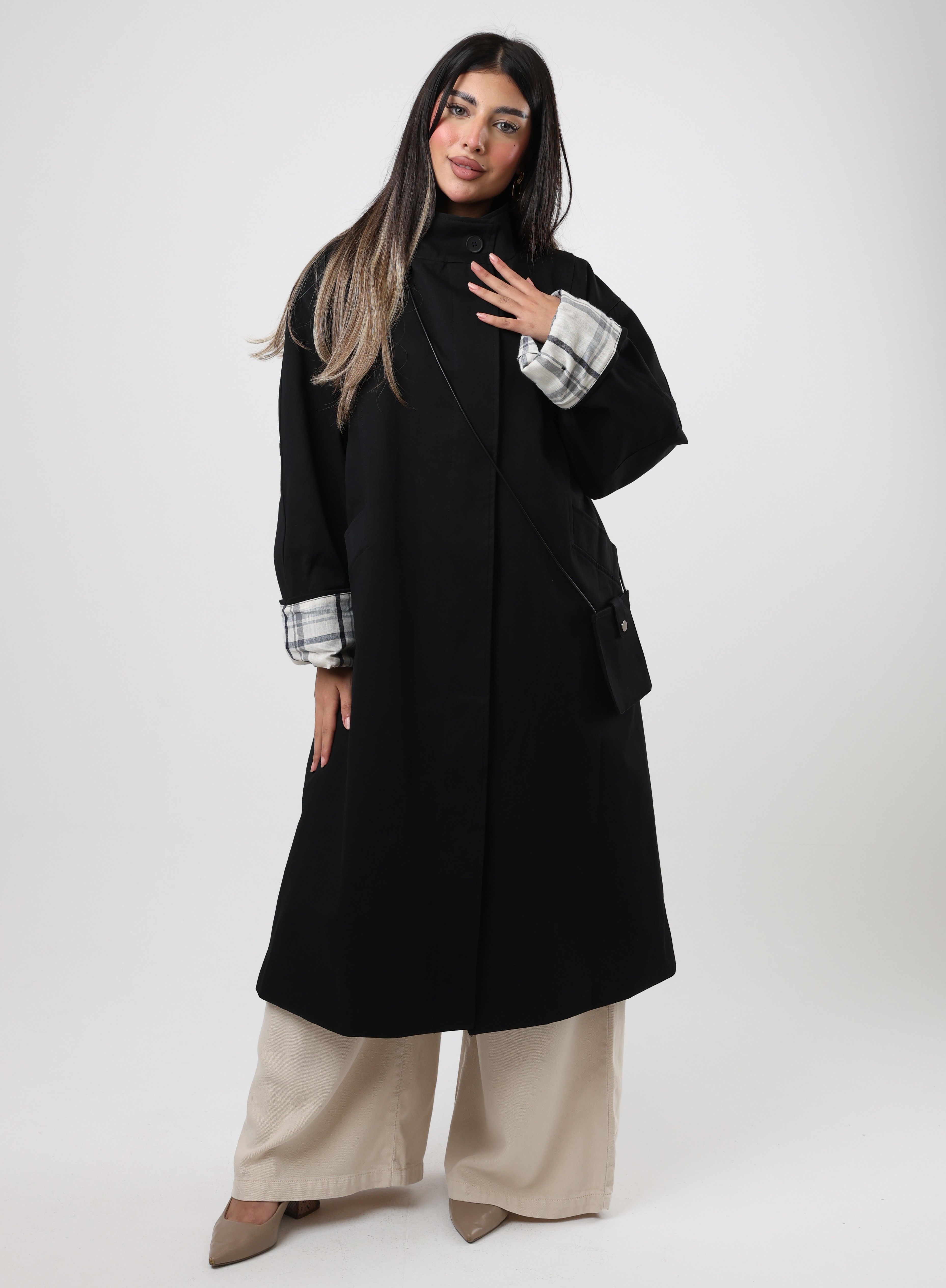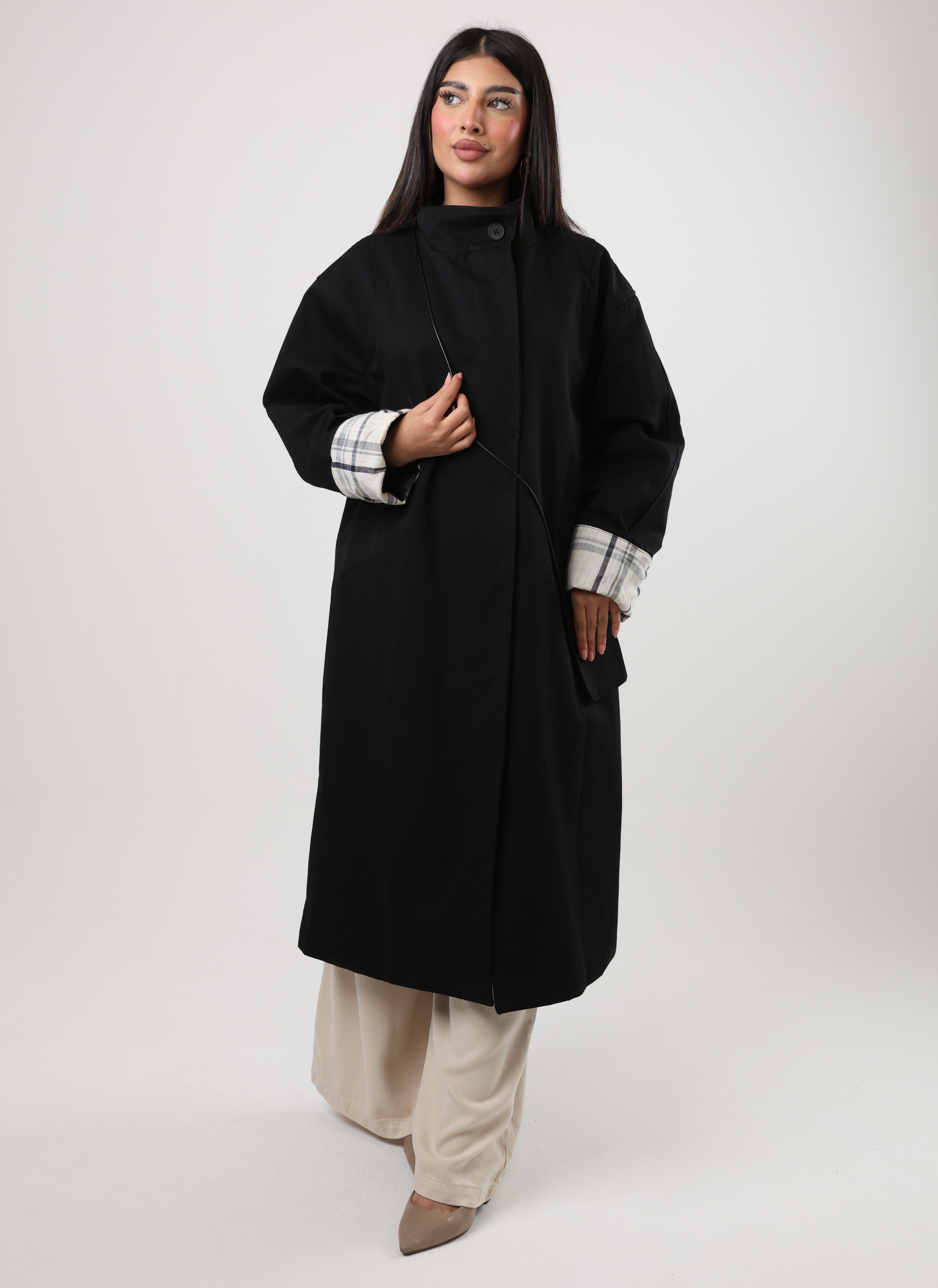 112542 - Black long coat Plaid cuff