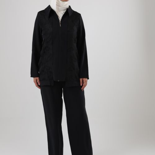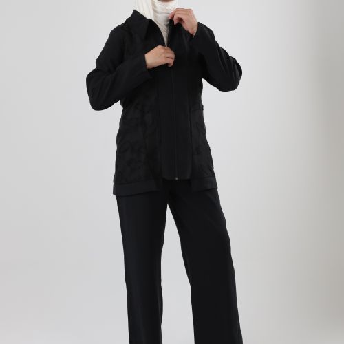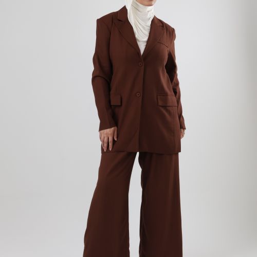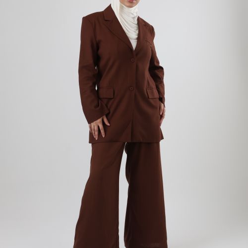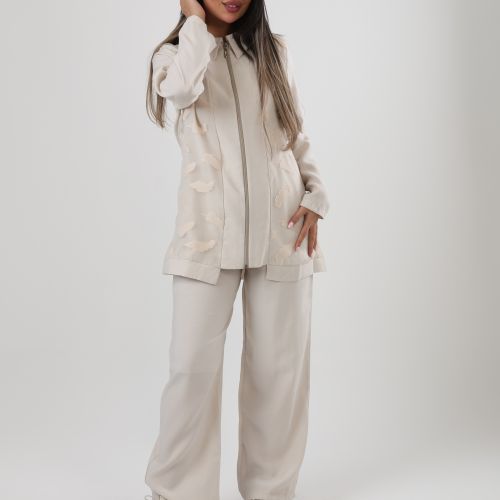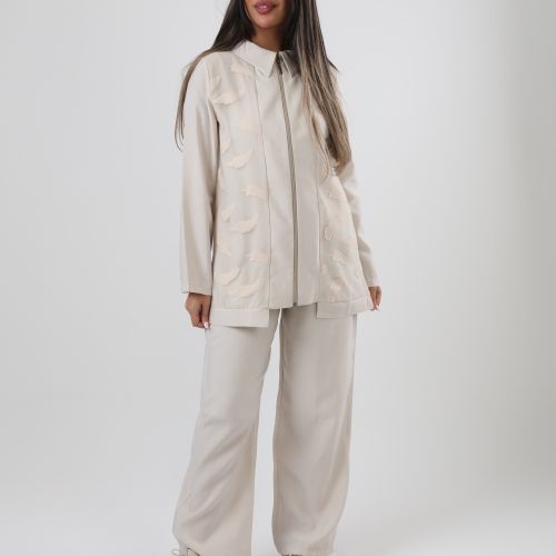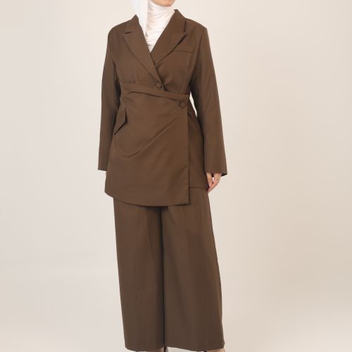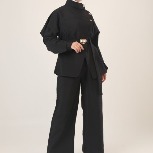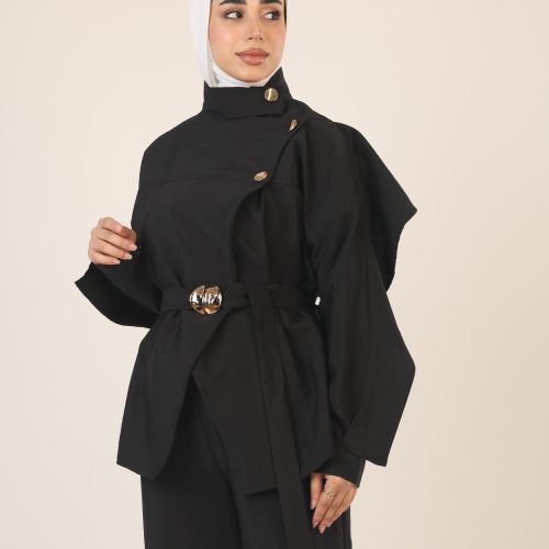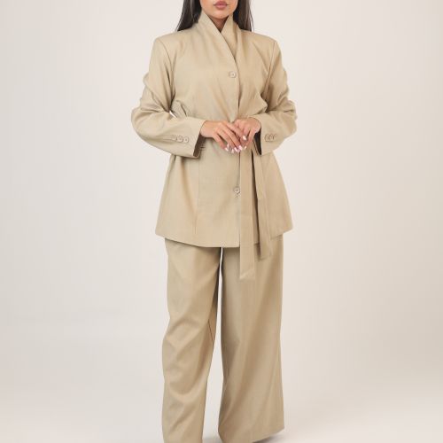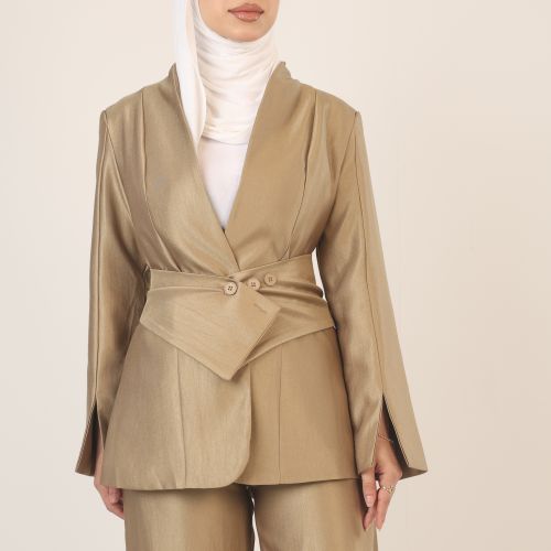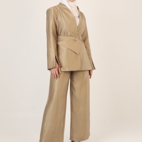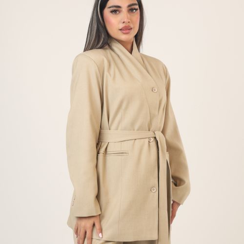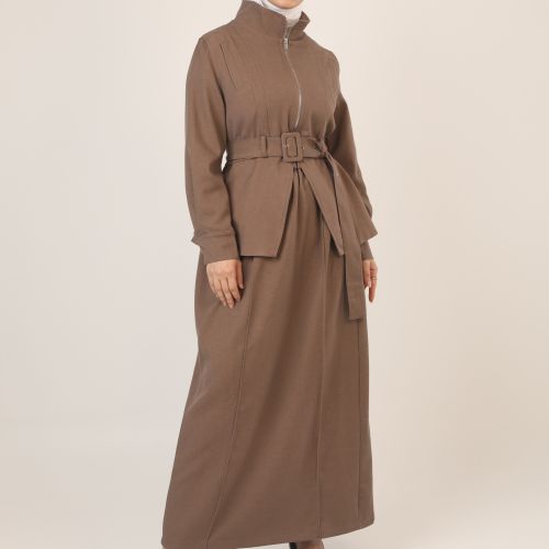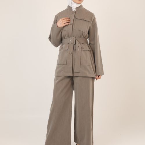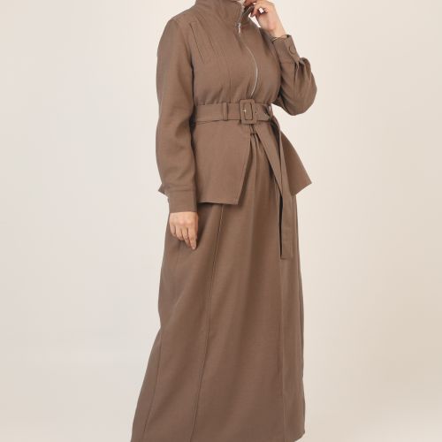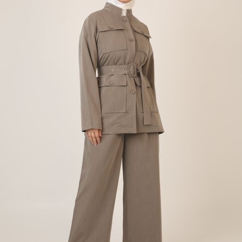 112506 - high collar belt jacket Maxi Skirt Set - Khaki